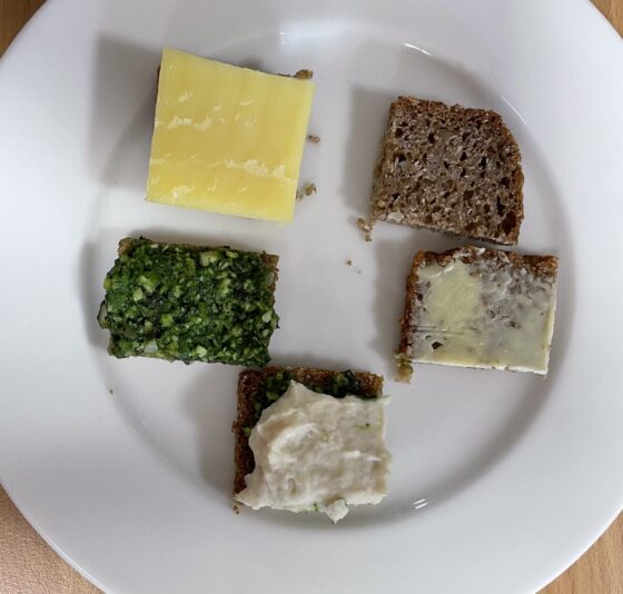 チーズ→そのままで→バター→白いんげんペースト→グリーンペースト(小松菜と黒豆)
